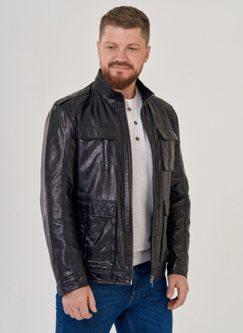 Кожаная куртка черного цвета. Модель дополнена карманами. Центральная застежка на молнию. Базовая модель, подходит для работы и прогулок. Воротник стойка защитит от ветра. Удобная длина изделия позволяет с комфортом гулять, работать и водить машину. Прямой фасон не будет сковывать движений.