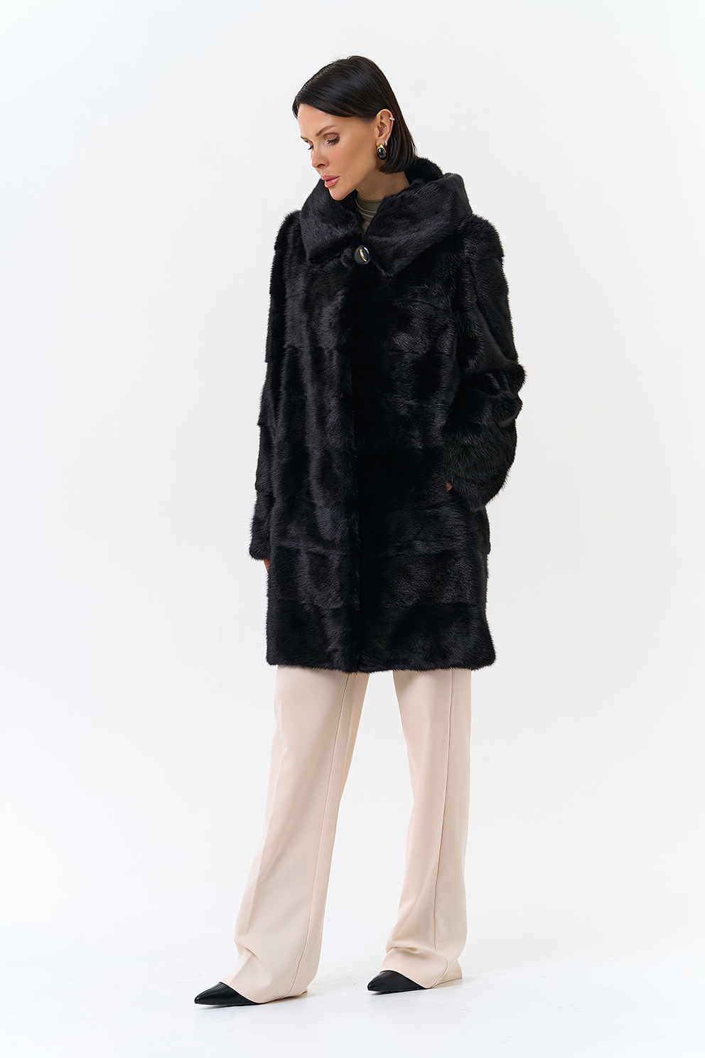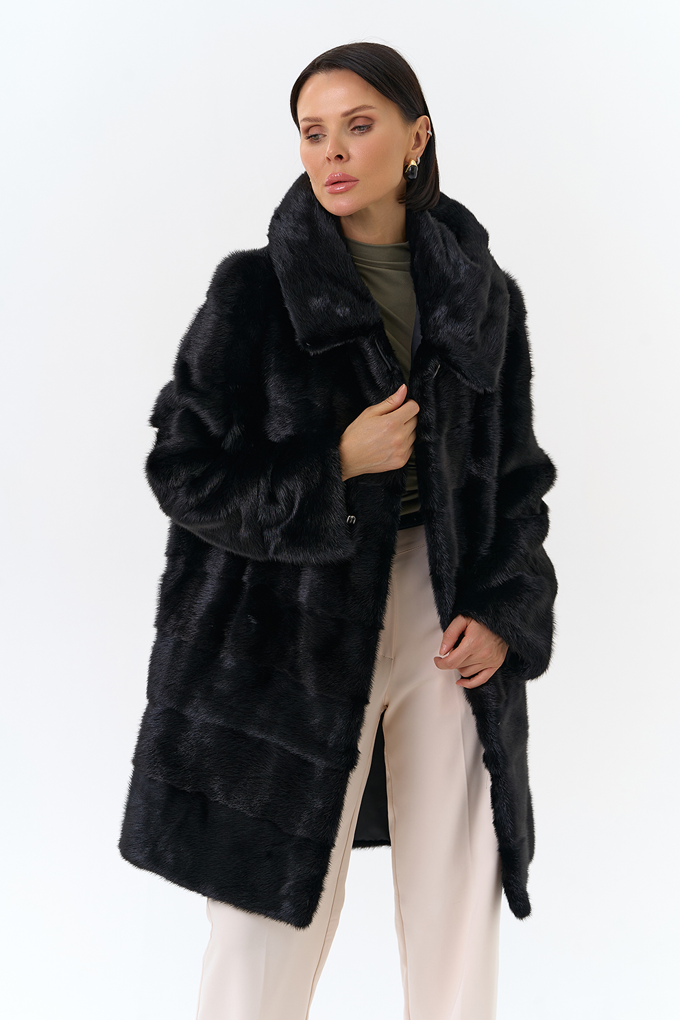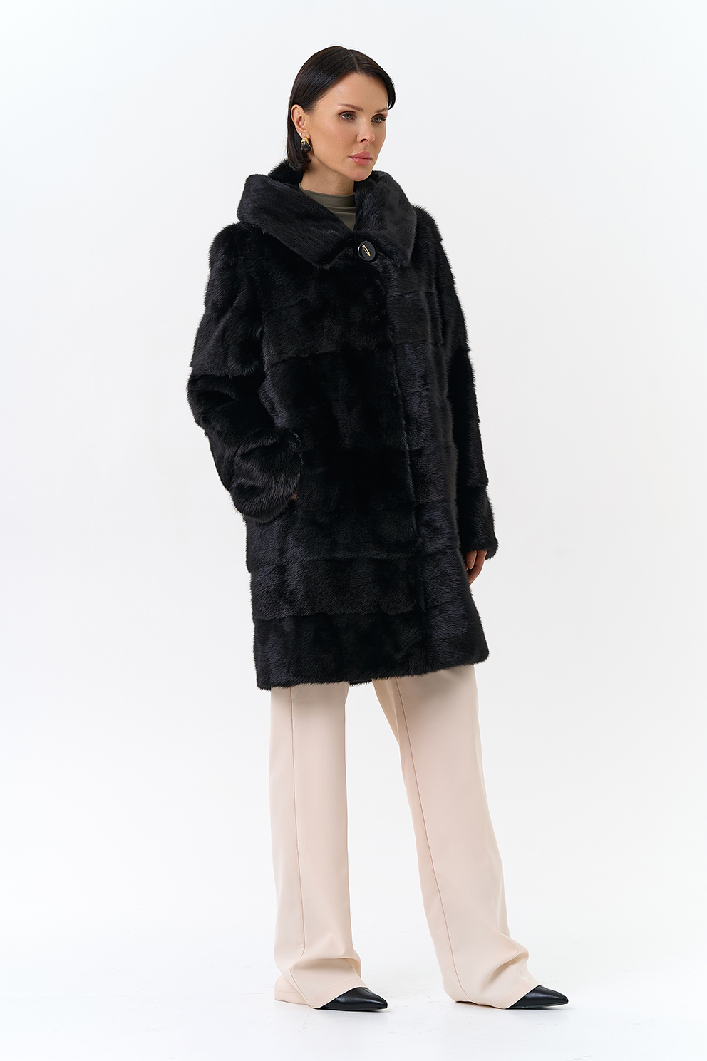 Шуба поперечной раскладки в черном цвете из меха норки.